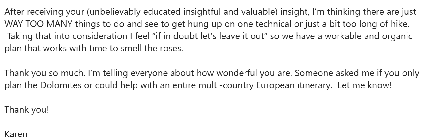 I was reviewing Karen's itinerary (that will be such an interesting hiking trip!) and creating Anthony's short winter getaway for his family (skiing, snowshoe hikes, Christmas markets, and snowmobile rides - bucket list, am I right???!)